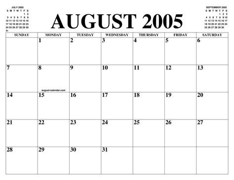 August 2005 Calendar United States