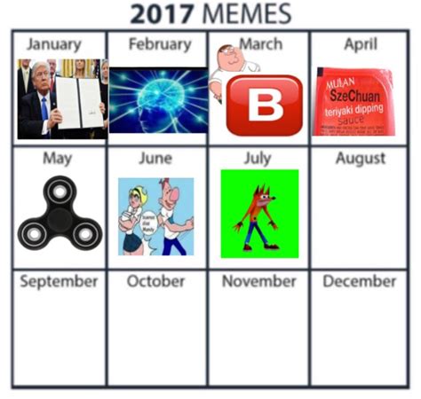 Meme 2017 Calendar. Not only was 2017 the best year for memes but jesus christ it was the worst fucking year too. Press the ← and → keys to navigate the gallery , 'g' to view the gallery, or 'r' to view a random.