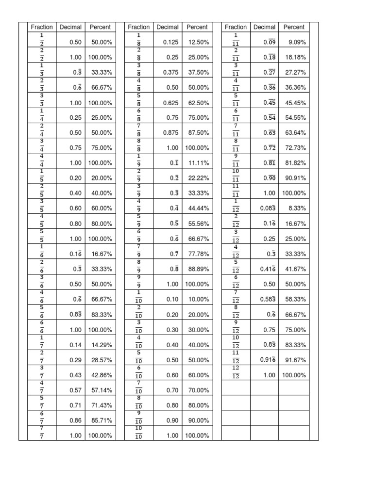 Fraction Decimal Percent Cheat Sheet w Repeating Decimals Lexicology