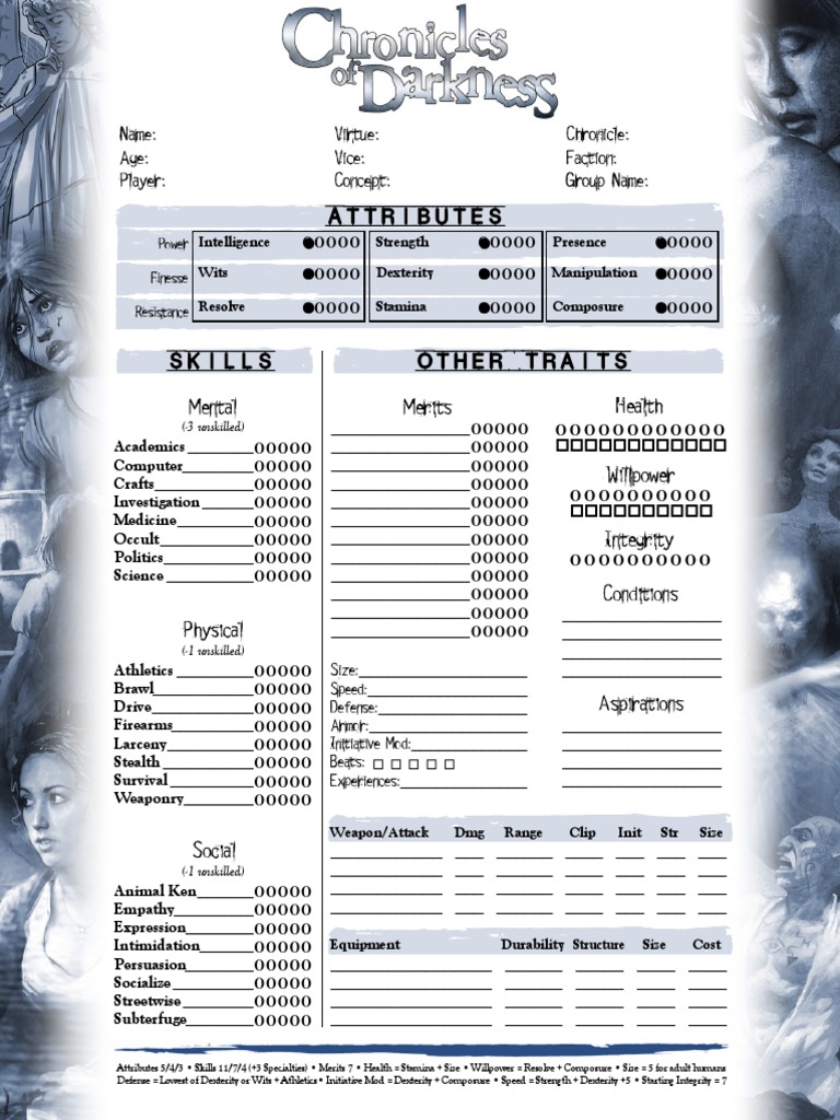 Web a collection of all the character sheets for onyx path's currently available chronicles of darkness games. Web world of darkness character sheets. There are many parts of the sheet that will automatically calculate derived traits, such as health, willpower,. The settings page has two.