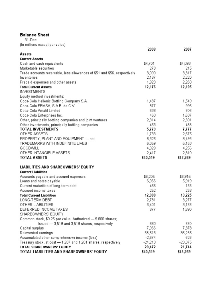 Coca Cola Co Balance Sheet Balance Sheet Stocks