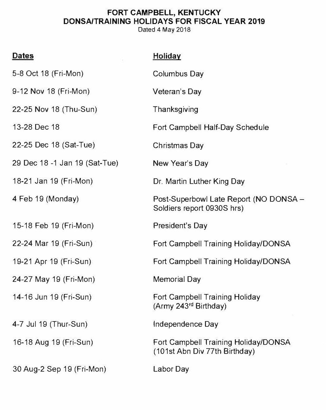 Donsa/training holidays for fiscal year 2023 always confirm with your chain of command if you will have these or other. After more than 60 years of serving the post community, the fort.