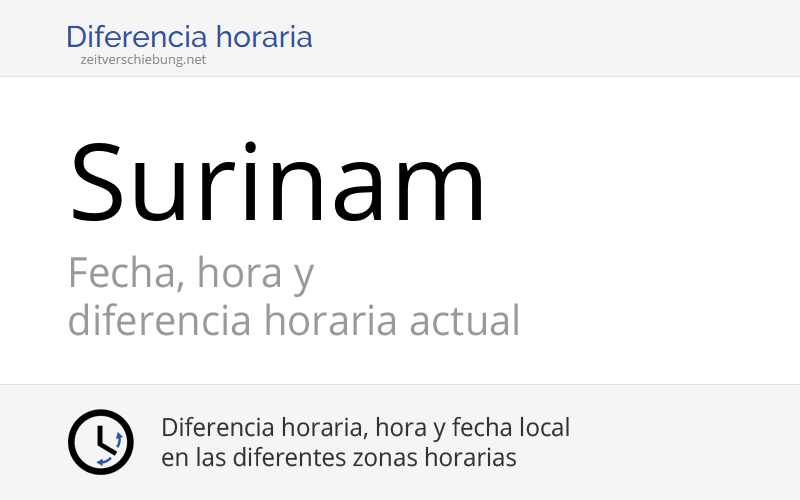 Reloj con la hora de surinam. La hora exacta en suriname es ahora. La hora en paramaribo es 2 horas. Hora actual en suriname time. Web descubra qué hora es en suriname en este momento.