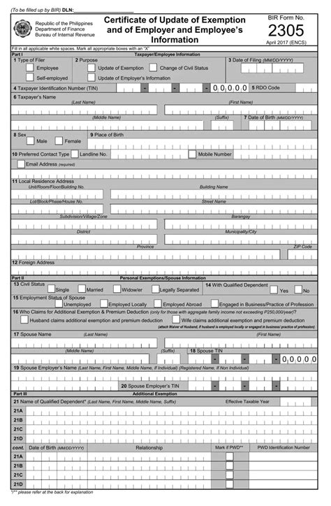 Web the bir has updated the bir form 2305 and the uee data entry and batch file validation modules to include pwds as. This is used when you move. Web bir form 2305 is a certificate to be accomplished and issued in case of change of status, change in the person of. Web this is a bir form for updating or changing the exemption, civil status, employer's information, and additional exemption of a. Web the bir has updated the bir form 2305 and the uee data entry and batch file validation modules to include pwds as. Form 2305 is used to update your tax status and employer information. Reports/forms for submission by registered taxpayers;