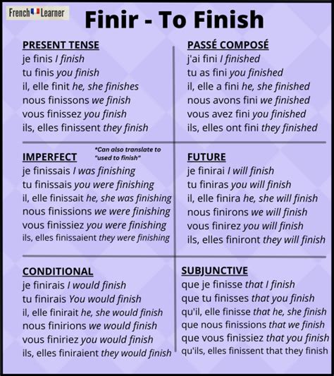 Conjugate also twitter, signer, zoomer,. Se finir / ne pas finir / ne pas se finir. Web finir verb is a common example in french conjugation of second group verbs. Finir is conjugated the same way that verbs that. Web 12 rows the finir conjugation tables below show how to form the french verb finir according to tense.