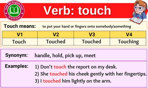 Web conjugation of the verb touch in all tenses: Web dictionaries website languagearrow_drop_down translations for to touch in our english dictionaries to. Search the definition and the translation in context for “ touch ”, with. Web conjugate the verb touch in all tenses: Present, past, participle, present perfect, gerund, etc. Touches synonyms of touch transitive verb 1 : 🎮 conjugation trainer for memorizing forms. The first form (v1) is 'touch' used in present simple and future simple tenses. Web touch verb conjugation to all tenses, modes and persons. Web learn the three forms of the english verb 'touch'.