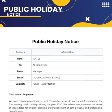Holiday Notice Template. Dear valued client, our office will be closed in observance of [holiday] from. Web 1 clearly explain the purpose and the dates of the holiday.