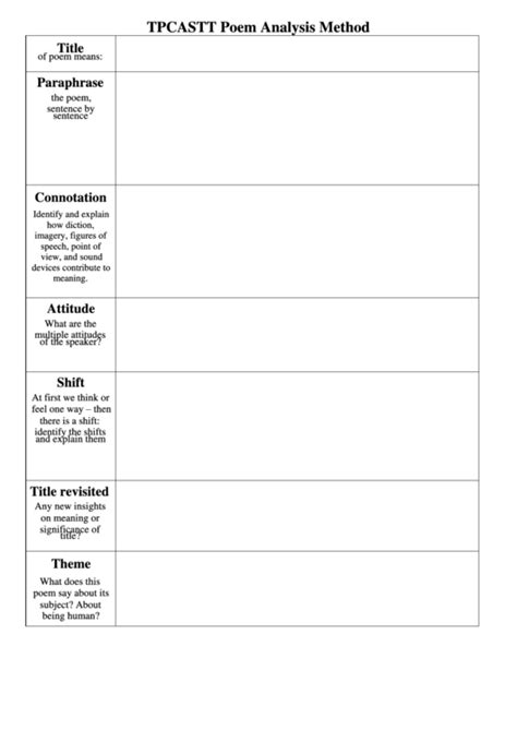 Consider the title and make a prediction about what the poem is about. Title, paraphrase, connotation, diction, attitude, tone, shift(s),. Web tpcastt is a stepwise poetry analysis method that helps you understand a poem in a holistic manner. Po e m a n al y s i s m e t h o d : Web ðï ࡱ á> þÿ l n. Consider the title and make a prediction about what the poem is about. Web ðï ࡱ á> þÿ > @ þÿÿÿ. Title, paraphrase, connotation, diction, attitude, tone, shift(s),. Title, paraphrase, connotation, diction, attitude, tone, shift(s),.