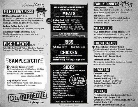City Barbeque Printable Menu. Web 118 rows their menu includes not just the perfectly smoked meats that they’re famous for, but also traditional sides that include. Web 1 that's some beautiful bark trust us, it's not burnt.