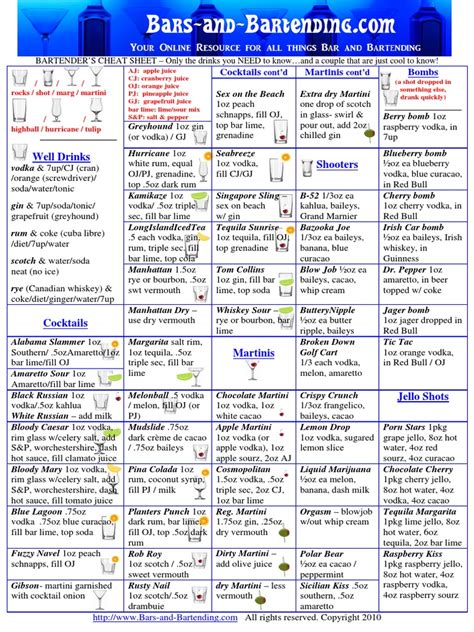 Free Bartending Cheat Sheet PDF download Bartender, Cheat sheets